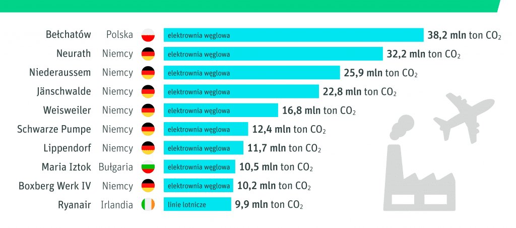 Pierwszy wniosek, jaki można wyciągnąć z danych przedstawionych przez Komisję Europejską, jest oczywisty. Największymi emiterami dwutlenku węgla pozostają elektrownie węglowe. Większość z tych, które trafiły na niechlubną listę, znajduje się na terenie Niemiec, ale pierwsze, niezbyt zaszczytne miejsce zajmuje niestety elektrownia przy Kopalni Węgla Brunatnego „Bełchatów”. 38,2 mln ton dwutlenku węgla to więcej, niż w 2017 roku wyemitowała cała Szwajcaria (34,4 mln ton COIndeks górny 22) czy Norwegia (35,3 mln ton COIndeks górny 22, źródło).