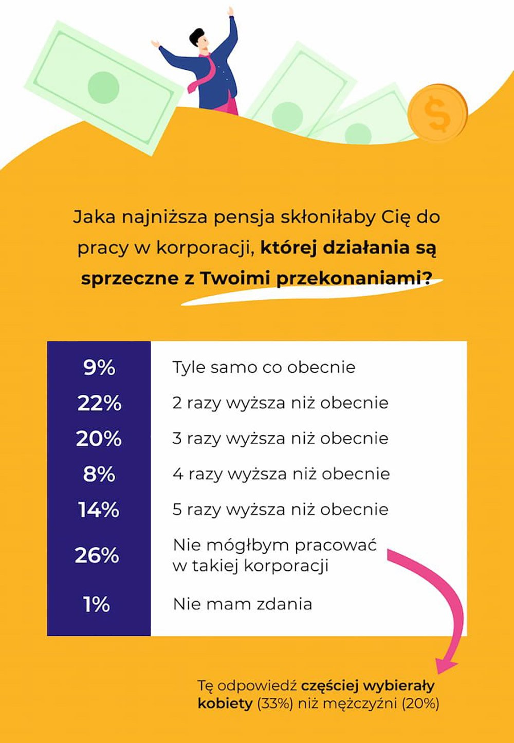 Kwestia pieniędzy przełamujących opory moralne okazuje się przy tym nie aż tak istotna, jak można byłoby się spodziewać. Zaskakujące, ale aż 22% Polaków zgodziłoby się na takie warunki współpracy za jedynie dwukrotność obecnej pensji, a 9% mogłoby nawet zarabiać tyle samo co obecnie. Jedynie co czwarty badany stwierdził, że za żadne pieniądze nie zdecydowałby się pracować w firmie, której działania byłyby sprzeczne z jego przekonaniami.