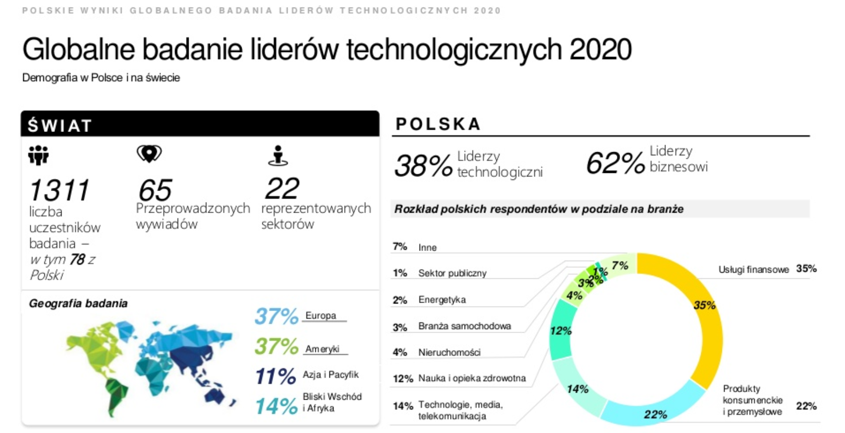 Celem badania 2020 Global Technology Leadership Study było sprawdzenie, w jaki sposób liderzy odpowiedzialni za technologie mają wskazać swoim organizacjom nowe sposoby myślenia, nowe cele z akcentem na zmianę. To kolejna edycja badania znanego wcześniej jako Global CIO Survey. Zmiana jego nazwy i zakresu była podyktowana pojawieniem się nowych stanowisk z obszaru zarządzania technologiami. Obok CIO (dyrektor IT) coraz częściej tworzone jest stanowisko CDO (dyrektor ds. danych / dyrektor ds. digitalizacji) czy CTO (dyrektor ds. technologii). Autorzy raportu przyjrzeli się, jak funkcjonują działy technologiczne i w jaki sposób zmienia się rola osób za nie odpowiedzialnych.