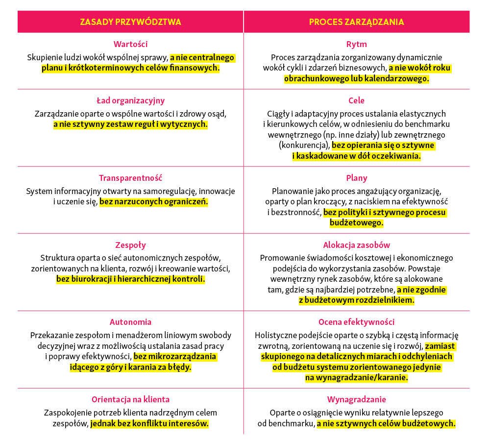 Rozpoczynając opowieść o beyond budgeting, wspomniałem, że nazywanie tej metody „brakiem budżetowania” nie oddaje jej prawdziwej istoty. Moim zdaniem nie jest to kolejna rewolucyjna technika budżetowania (lub „nie‑budżetowania”), ale raczej zmiana podejścia do zarządzania, która eliminuje wszystkie te elementy klasycznego budżetu, które są wąskim gardłem organizacji działających w dynamicznym i niepewnym otoczeniu biznesowym. Jednocześnie wspiera ona planowanie i podejmowanie decyzji dodatkowymi narzędziami, wśród których znaleźć można m.in.: