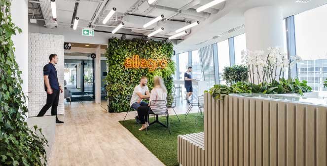 A gdyby biuro wyglądało jak dom? Gdyby pozytywna energia środowiska domowego mogła działać także w miejscu pracy? Gdybyśmy przy projektowaniu biura zastosowali inne materiały wykończeniowe, użyli więcej drewna, ciepłych kolorów i pomyśleli o większej ilości zieleni? Doszliśmy do wniosku, że jest to możliwe. Spotkania nie muszą odbywać się w standardowych salach konferencyjnych, ale w miejscu zaaranżowanym jako salon. Przestrzeń do spotkań kreatywnych mogłaby wyglądać jak garaż, a przestrzeń wspólna dla wszystkich pracowników mogłaby być kuchnią otwartą na pokój dzienny i ogród zimowy. „Tak zaprojektowaliśmy warszawską siedzibę Allegro. Udało nam się stworzyć miejsce, do którego ludzie chcą wracać. Biuro‑dom Allegro to przestrzeń, która pomaga budować relacje. To środowisko, w którym znajdziesz przestrzeń do realizacji każdego zadania w tym zróżnicowanym i kreatywnym tyglu” – mówi Dominika Zielińska, Managing Partner w Workplace Solutions.