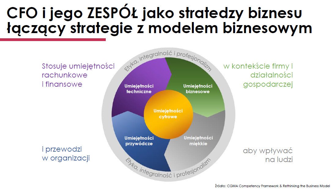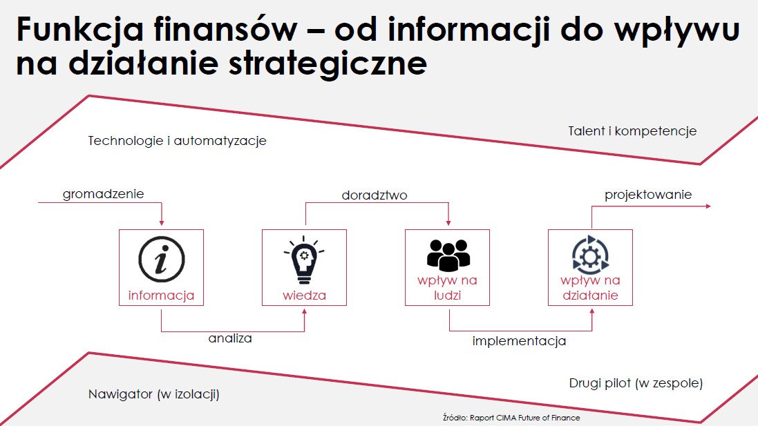 Następnie głos zabrał Jakub Bejnarowicz, dyrektor regionalny na Europę w Instytucie CIMA, mówca i uczestnik konferencji poświęconych przyszłości biznesu i zawodu finansisty, który przybliżył zadania i role CFO w organizacji. Obecnie model operacyjny finansów obejmuje zarówno funkcje księgowo‑finansowe, jak i te związane z tworzeniem wiedzy i wartości organizacji. Wśród tych funkcji możemy wyróżnić dostarczanie biznesowi prognoz rozwoju działalności, wsparcie rozwoju przedsiębiorstwa i jego innowacyjności, a także wdrażanie rozwiązań automatyzujące transakcyjne procesy finansowe. Jak pokazuje najnowszy raport CIMA „Future of Finance”, aż 64% uwagi ekspertów ds. rachunkowości zarządczej (management accountants) koncentruje się na tworzeniu wartości.