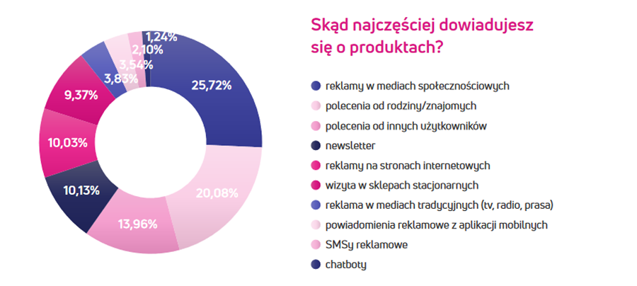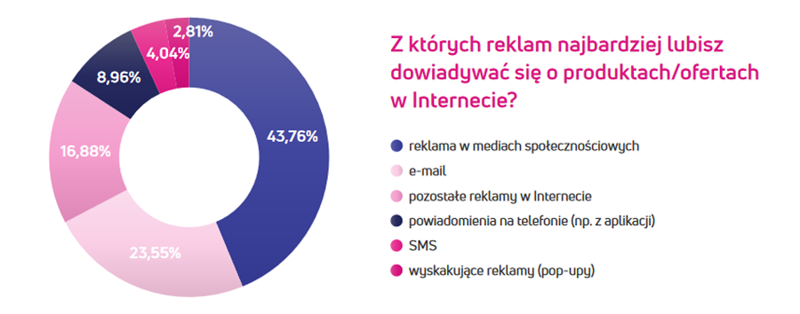Polacy najczęściej dowiadują się o interesujących ich produktach od rodziny i znajomych (34%), a także z reklam umieszczonych w mediach społecznościowych (26%). Wśród wszystkich rodzajów ogłoszeń właśnie reklamy w social media klienci przyjmują najchętniej, co dowodzi tego, jak istotne jest skuteczne profilowanie i targetowanie. Dość dobrze odbierane są też informacje handlowe wysyłane za pośrednictwem poczty elektronicznej. I w tym wypadku warto jednak postawić na personalizację oferty i wykorzystanie wiedzy o już dokonanych zakupach czy zachowaniach użytkowników na stronie sklepu.