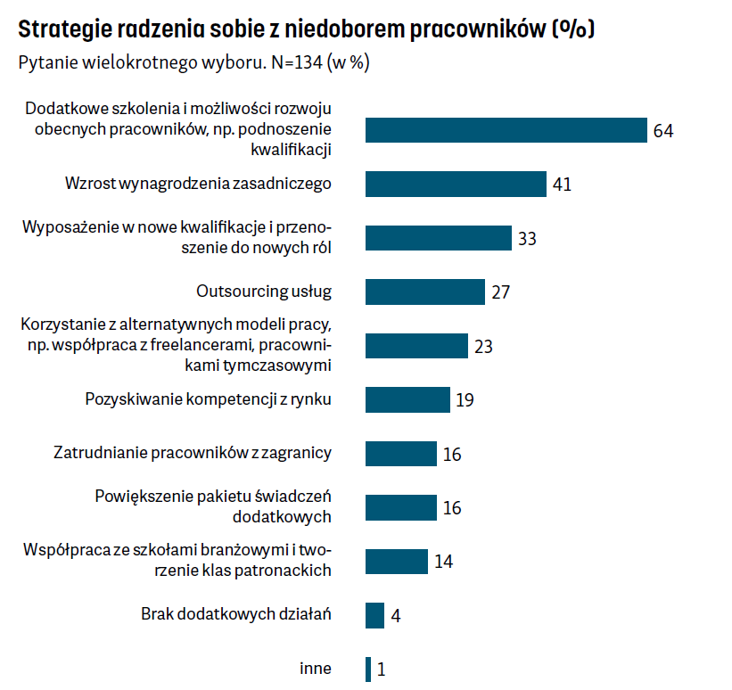 Firmy radzą sobie z niedoborem ludzi w różny sposób. Najczęściej inwestują w szkolenia i podnoszenie kwalifikacji zatrudnionych lub podnoszą pensje. Benefity pozapłacowe są tylko miłym uzupełnieniem wynagrodzenia. Blisko 90% respondentów korzysta z elastycznych form zatrudnienia, z czego dwie trzecie stanowi praca tymczasowa.