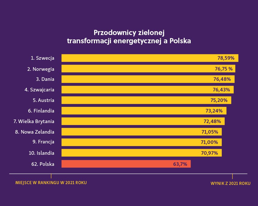 Europa wybija się na prowadzenie w pogoni za czystą energią. Pierwszą dziesiątkę państw w rankingu ETI (która odpowiada jedynie za 3% globalnej emisji CO2 ze spalania paliw) reprezentują wyłącznie europejskie kraje na czele ze Szwecją (1), Norwegią (2) i Danią (3). Co wyróżnia kraje, którym transformacja energetyczna idzie najlepiej? Łączy je niski poziom dotacji na paliwa kopalne, zwiększone bezpieczeństwo energetyczne i otoczenie regulacyjne napędzające transformację energetyczną.