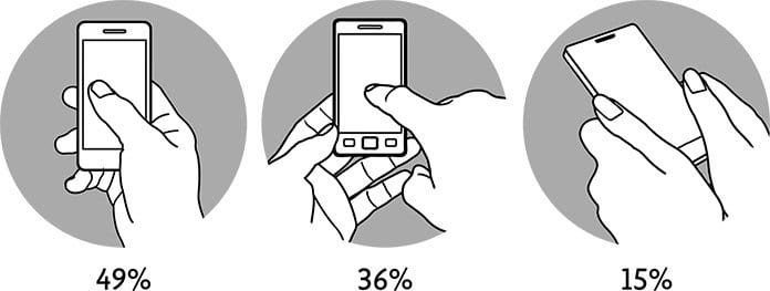 Zdecydowanie opłaci się również zwrócenie uwagi na to, w jaki sposób użytkownicy posługują się swoimi smartfonami, czyli np. jak je trzymają. Jak wynika z analizy badacza Stevena Hoobera, który w 2013 r. wyszedł na ulicę, aby obserwować sposób ułożenia dłoni posiadaczy telefonów komórkowych, większość osób (49%) trzyma urządzenie jedną ręką, klikając w ekran jedynie kciukiem. 39% również trzymało telefon w jednej ręce z tą różnicą, że klikało w jego ekran palcem drugiej dłoni, natomiast pozostałe 15% chwytało smartfona oburącz, klikając obydwoma kciukami.