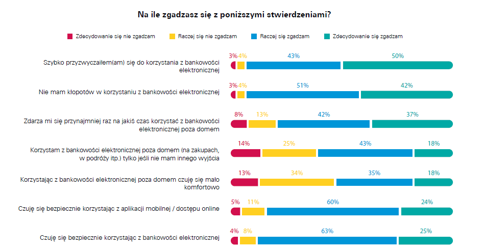 Co jednak najważniejsze – powszechne jest poczucie bezpieczeństwa podczas korzystania z bankowości elektronicznej (88% wskazań). Polacy coraz bardziej akceptują również mobilne rozwiązania oferowane przez banki – 79% respondentów potwierdziło, że korzystało już z bankowości elektronicznej poza domem. Pomimo że polscy konsumenci w coraz większym stopniu przenoszą się do kanału mobilnego, to jednak aż ponad połowa respondentów przyznaje, że nadal czuje się mało komfortowo, korzystając z bankowości elektronicznej poza domem. Chodzi przede wszystkim o dostęp do pieniędzy w tzw. sytuacjach awaryjnych, ale również podczas wakacji – kiedy przykładowo nie kontrolujemy informacji o tym, że bank planuje przerwę techniczną.