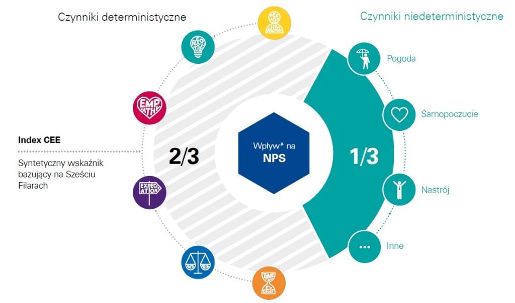 W tym aspekcie pomocne okazuje się korzystanie z metodologii Sześciu Filarów™ Customer Experience (o której szczegółowo poniżej), które reprezentują ? czynników składających się na kształtowanie opinii konsumenta w zakresie jego chęci do rekomendacji danej marki. Pozostała ? zmienności NPS wynika z tzw. czynników niedeterministycznych, takich jak pogoda czy nastrój klienta.