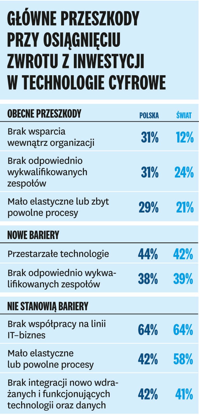 Według badania jedynie 44% respondentów z Polski uważa swoją firmę za dojrzałą cyfrowo – to poniżej średniej dla Europy Środkowo‑Wschodniej (47%) i świata (53%). Do barier, które utrudniają uzyskanie wyników z inwestycji w technologie cyfrowe, najczęściej zaliczano brak wykwalifikowanych zespołów. To bardzo niepokojące zjawisko, stanowiące zagrożenie dla harmonijnego przebiegu transformacji cyfrowej, dotyczy aż 69% badanych w Polsce i 63% na świecie. Respondenci wskazali, że ich przedsiębiorstwom brakuje kompetencji w obszarach związanych z cyberbezpieczeństwem, ochroną oraz analityką danych. Poza tym za główne przeszkody w osiągnięciu wzrostu z inwestycji w technologie cyfrowe ankietowani uznali brak wsparcia wewnątrz firmy i mało elastyczne lub zbyt powolne procesy (odpowiednio 31% i 29% wskazań). Ich zdaniem, ze wszystkich wskazanych barier tylko luka kompetencyjna będzie się w przyszłości pogłębiać. Tak twierdzi 38% respondentów w Polsce i 39% na świecie.