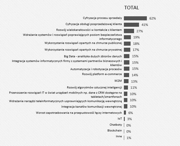 Na transformację cyfrową decyduje się coraz więcej polskich przedsiębiorstw. Jej przebieg, zakres i rola uzależnione są od stawianych celów. Proces ten to ciągła zmiana i doskonalenie, a nie projekt, który można zamknąć w ciągu roku lub dwóch. Jak pokazują wyniki badania Orange Insights wykonanego przez ICAN Research około 8% dużych firm i korporacji wpisuje nowe technologie w model biznesowy. Cyfryzacja staje się dla nich kluczowym narzędziem służącym do zwiększania efektywności rynkowej. Przykładem mogą być bankowość i e‑commerce, gdzie zaciera się granica między technologią a tradycyjnie rozumianym biznesem. Inwestycja w cyfryzację to w ich przypadku krótko- i długoterminowe cele, obarczone ryzykiem niepowodzenia. Te firmy najszybciej adaptują nowe technologie. Obecnie 83% z nich wdrożyło modele uczenia maszynowego, a 63% rozwija projekty sztucznej inteligencjiIndeks górny 11.