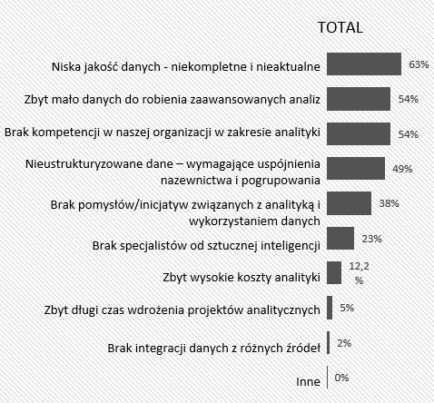 Właśnie analizowaniedanych jest największym wyzwaniem dla polskich przedsiębiorstw. Połowa dużych organizacji w Polsce uważa, że nie ma takich kompetencji (54%), a najbardziej zaawansowane rozwiązania sztucznej inteligencji wykorzystuje jedna na sto dużych firm.