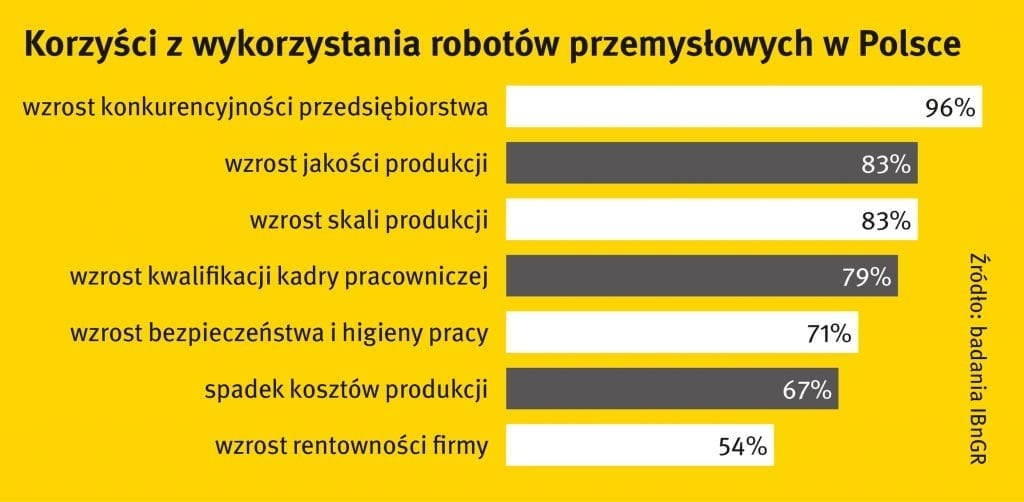 Argumentami przemawiającymi za robotami są przede wszystkim korzyści ekonomiczne: poprawa wydajności, jakości i powtarzalności, a także niższe koszty produkcji. Według raportu „Wpływ robotyzacji na konkurencyjność polskich przedsiębiorstw”, opracowanego przez Instytut Badań nad Gospodarką Rynkową, firmy, które wdrożyły u siebie roboty przemysłowe, odnotowały wyraźne wzrosty – ponad 83% zwiększyło skalę produkcji, 54% podniosło rentowność, a 33% zaczęło zwiększać sprzedaż za granicą. W tym samym czasie 67% firm zauważyło spadek kosztów produkcji. 80% respondentów zadeklarowało, że roboty pozwoliły im utrzymać stały poziom zatrudnienia, a w części przypadków nawet stworzyć dodatkowe miejsca pracy.