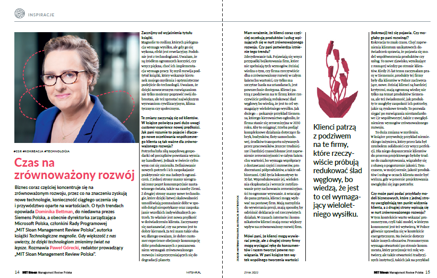 Biznes coraz częściej koncentruje się na zrównoważonym rozwoju, przez co na znaczeniu zyskują nowe technologie, konieczność ciągłego uczenia się i przywództwo oparte na wartościach. O tych trendach opowiada Dominika Bettman, do niedawna prezes Siemens Polska, a obecnie dyrektorka zarządzająca Microsoft Polska, członkini Rady Programowej „MIT Sloan Management Review Polska”, autorka książki Technologiczne magnolie. Gdy większość z nas uwierzy, że dzięki technologiom zmienimy świat na lepsze. Rozmawia Paweł Górecki, redaktor prowadzący „MIT Sloan Management Review Polska”.