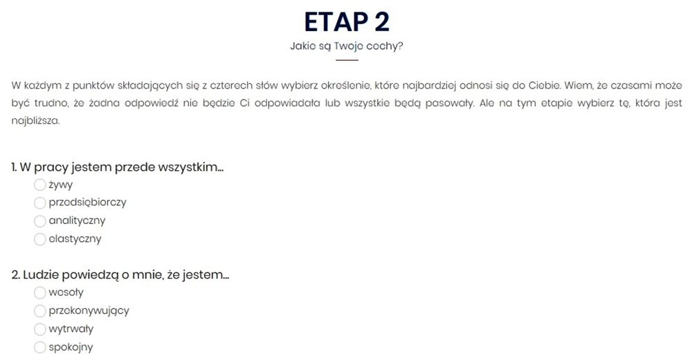 Drugi etap testu ma odmienny charakter. Każde z 40 stwierdzeń należy zakończyć jednym z czterech zaproponowanych słów. Może zdarzyć się, że żadne ze słów nie będzie nam pasować, wtedy trzeba wybrać to najbliższe prawdy. Na wykonanie tego testu należy przeznaczyć około 15‑20 minut. Wynik testu wysyłany jest na podany adres e‑mail.