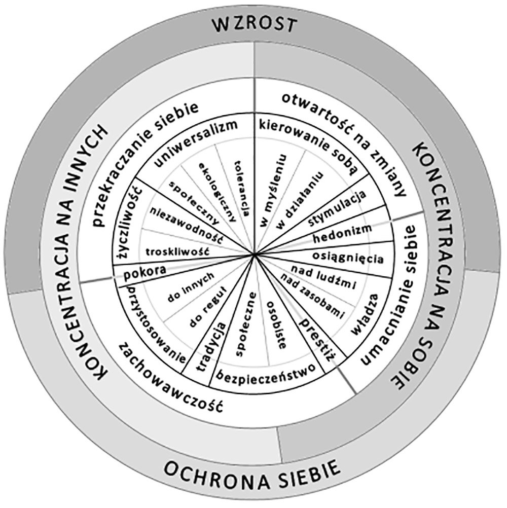 Indeks górny Im bliżej siebie znajdują się poszczególne elementy, tym większe jest ich motywacyjne podobieństwo. Wartości ustawione naprzeciw siebie są motywacyjnie przeciwstawne. Źródło: Cieciuch, J., Schwartz S. H. (2018). Pomiar wartości w kołowym modelu Schwartza. W: H. Gasiul (red.), Metody badania emocji i motywacji. S. 312. Warszawa: Difin. Indeks górny koniecIm bliżej siebie znajdują się poszczególne elementy, tym większe jest ich motywacyjne podobieństwo. Wartości ustawione naprzeciw siebie są motywacyjnie przeciwstawne. Źródło: Cieciuch, J., Schwartz S. H. (2018). Pomiar wartości w kołowym modelu Schwartza. W: H. Gasiul (red.), Metody badania emocji i motywacji. S. 312. Warszawa: Difin.