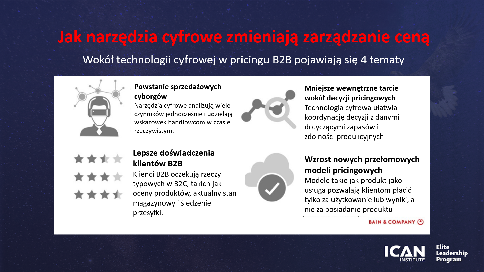 Zapraszamy do relacji z konferencji z cyklu Elite Leadership Program organizowanej przez ICAN Institute. Odkryj sekret inteligentnego pricingu i uzyskaj cenę adekwatną do wartości dostarczanej klientom! Dzięki najskuteczniejszym metodom zarządzania cenami i przychodami zapewnisz firmie nowe możliwości rozwoju i wykorzystasz szanse na dodatkowe zyski. Gościem specjalnym jest Madhavan Ramanujam, światowy autorytet w zakresie monetyzacji innowacji, architekt sukcesu takich cyfrowych gigantów jak UBER czy LinkedIn. Na co dzień doradza ze swojego biura w Dolinie Krzemowej firmom z listy Fortune 500s oraz globalnym startupom.