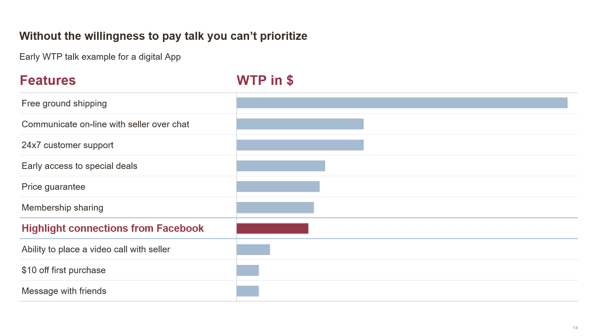 W pierwszej kolejności powinniśmy skupić się na oszacowaniu ceny, po jakiej klient będzie chciał kupić nasz przyszły produkt. Bez tego może się okazać, że cena będzie zbyt wysoka, co odstraszy klientów. Dlatego projektując aplikację mobilną, warto skupić się na funkcjach, które zwiększą szansę na dokonanie przez użytkownika transakcji, takich jak darmowa dostawa, możliwość porozmawiania ze sprzedawcą za pomocą czatu, czy kontaktu z obsługą klienta 24 godziny na dobę. Złe dopasowanie ceny do produktu może prowadzić do sytuacji jak w przypadku Google Glass, które okazały się porażką, ponieważ producent nie przemyślał, czy klienci będą chcieli wydać pieniądze na taki gadżet.