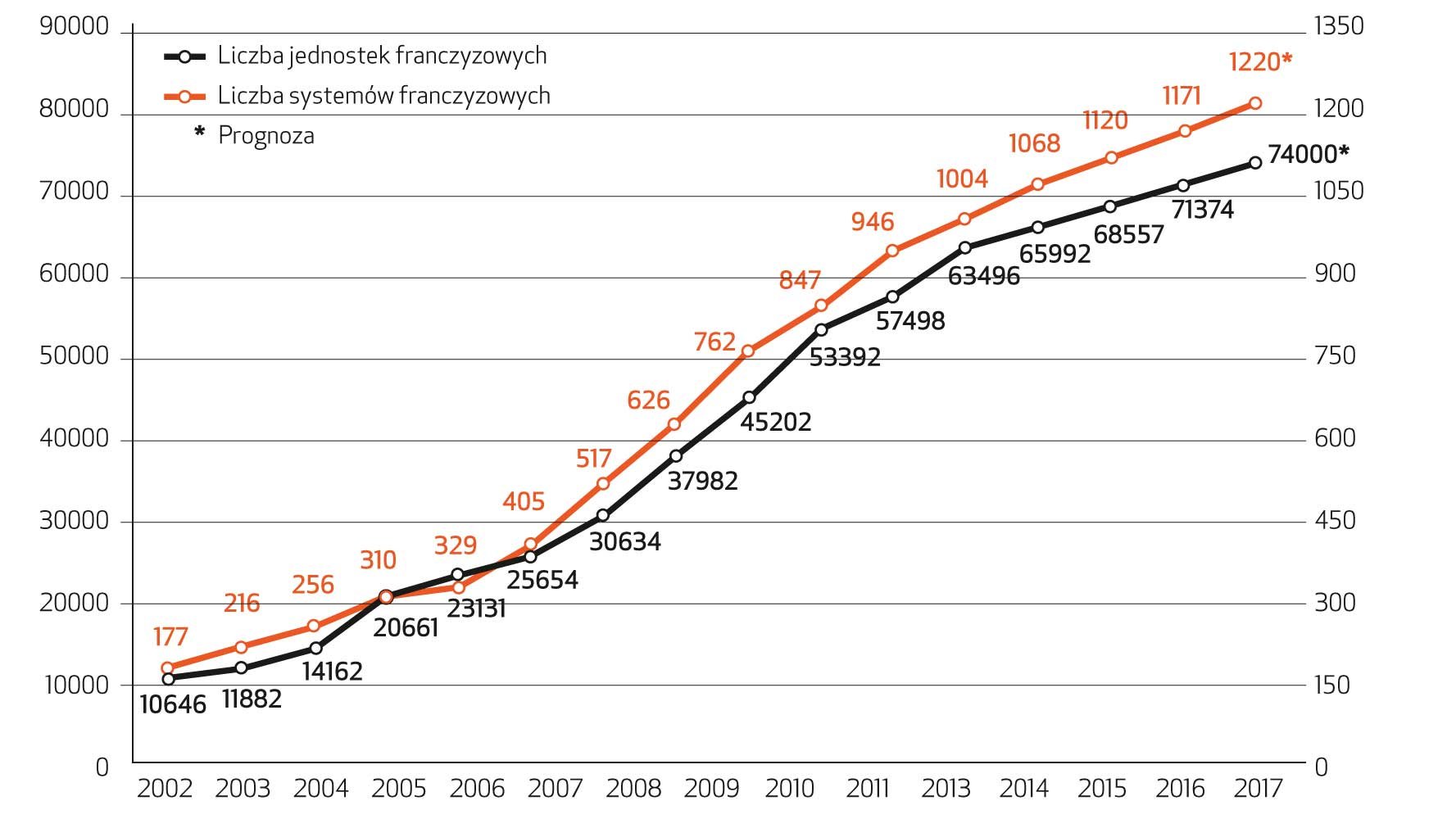 Liczba systemów i jednostek franczyzowych w Polsce w latach 2002‑2017
