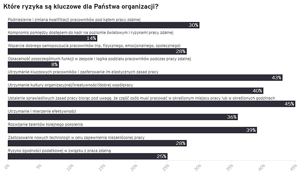 Według raportu EY tylko 15% pracodawców zabrało się już do reorganizowania pracy pod kątem funkcjonowania w post‑pandemicznym świecie, 25% ogłosiło takie plany pracownikom, a kolejne 24% twierdzi, że co prawda ma już plan, ale go jeszcze nie upubliczniło. 17% przyjęło postawę wyczekującą, przekładając podjęcie decyzji w kwestii zmian obecnego modelu funkcjonowania firmy na „potem”.
