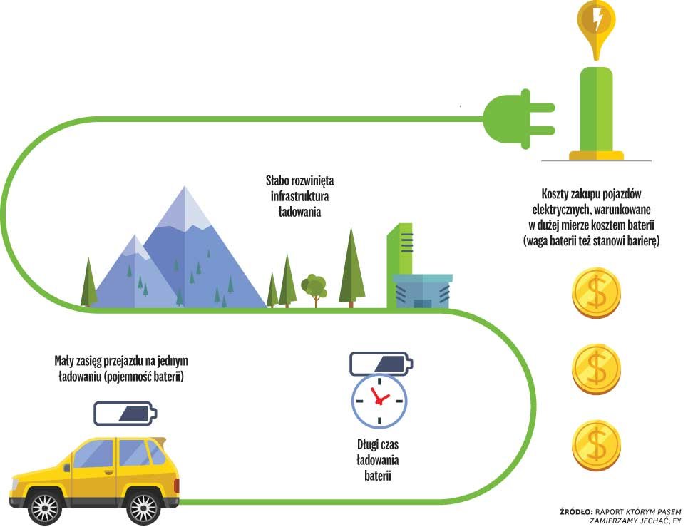 Jednak udział rynkowy samochodów elektrycznych wciąż jest znikomy. Można śmiało powiedzieć, że są one niszową technologią – jedynie 0,5% samochodów osobowych sprzedanych w Europie w roku 2016 stanowiły auta elektryczne. Prawie 40% rynku nowo sprzedanych pojazdów tego typu przejęły Chiny, ale nawet tam udział samochodów elektrycznych wśród wszystkich nowo sprzedanych wynosi poniżej 1,5%. Nie zanosi się, aby ten udział gwałtownie wzrósł, choć szanse na przyspieszenie są. Z raportu Którym pasem zamierzamy jechać, przygotowanego przez EY i ING Bank Śląski, wynika, że do 2023 roku podwoi się liczba sprzedawanych samochodów elektrycznych. Jest wiele powodów tego wzrostu, zanim jednak do niego dojdzie, niedojrzały rynek będzie musiał pokonać kilka istotnych barier.