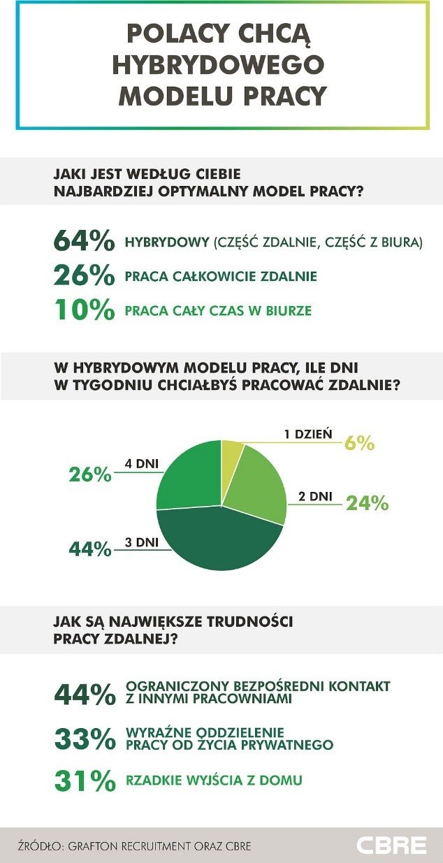 Od początku ubiegłego roku skokowo następowała redefinicja pojęcia biura wśród jego użytkowników. Dotąd dobrze znane pracownikom fizyczne miejsce pracy okazało się nie być jedynym słusznym, z którego możemy wykonywać pracę. Polacy ze względu na pandemię w większości zmuszeni byli przenieść „biura” do swoich domów. Okazało się, że zdaliśmy ten test na wysokim poziomie. Czy jednak na dłuższą metę praca wyłącznie zdalna ma szansę z nami pozostać? Badania Grafton Recruitment oraz CBRE pokazują, że 64% pracowników chciałoby pracować w trybie mieszanym, a początkowe zadowolenie z pracy zdalnej zaczęło sprawiać trudności.
