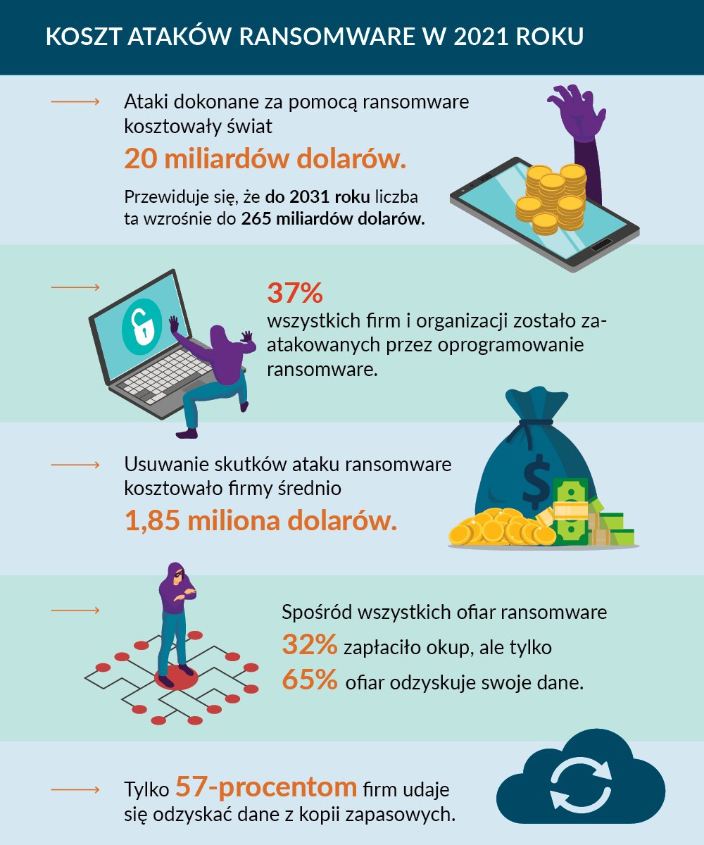 Wojna, którą toczą w sieci państwa i prywatne przedsiębiorstwa z cyfrowymi przestępcami, kosztuje gigantyczne pieniądze (patrz niżej Koszt ataków ransomware w 2021 roku). Z corocznego raportu Cost of a Data Breach, opublikowanego przez IBM w lipcu ubiegłego roku, wynika, że średnia strata, jaką duże korporacje ponoszą przez utratę danych wykradzionych przez hakerów, przekroczyła 4 mln dolarów i jest o 10% większa niż w 2020 roku, kiedy cyberprzestępcy potrafili ukraść jednorazowo z systemu IT nawet do 100 tys. rekordów. Z kolei pewna niewymieniona z nazwy korporacja zapłaciła okup wynoszący 400 mln dolarów, by odzyskać dane. W jej przypadku hakerzy wykradli z systemów informatycznych blisko 65 mln rekordów. Koszt utraty danych to jedno, pozostaje też kwestia utraty zdolności operacyjnej, często przez dłuższy czas, i zupełnie niewymierny koszt utraty reputacji i zaufania klientów.