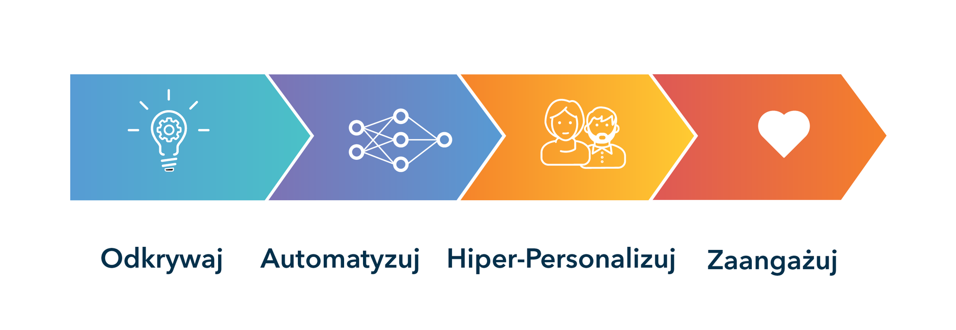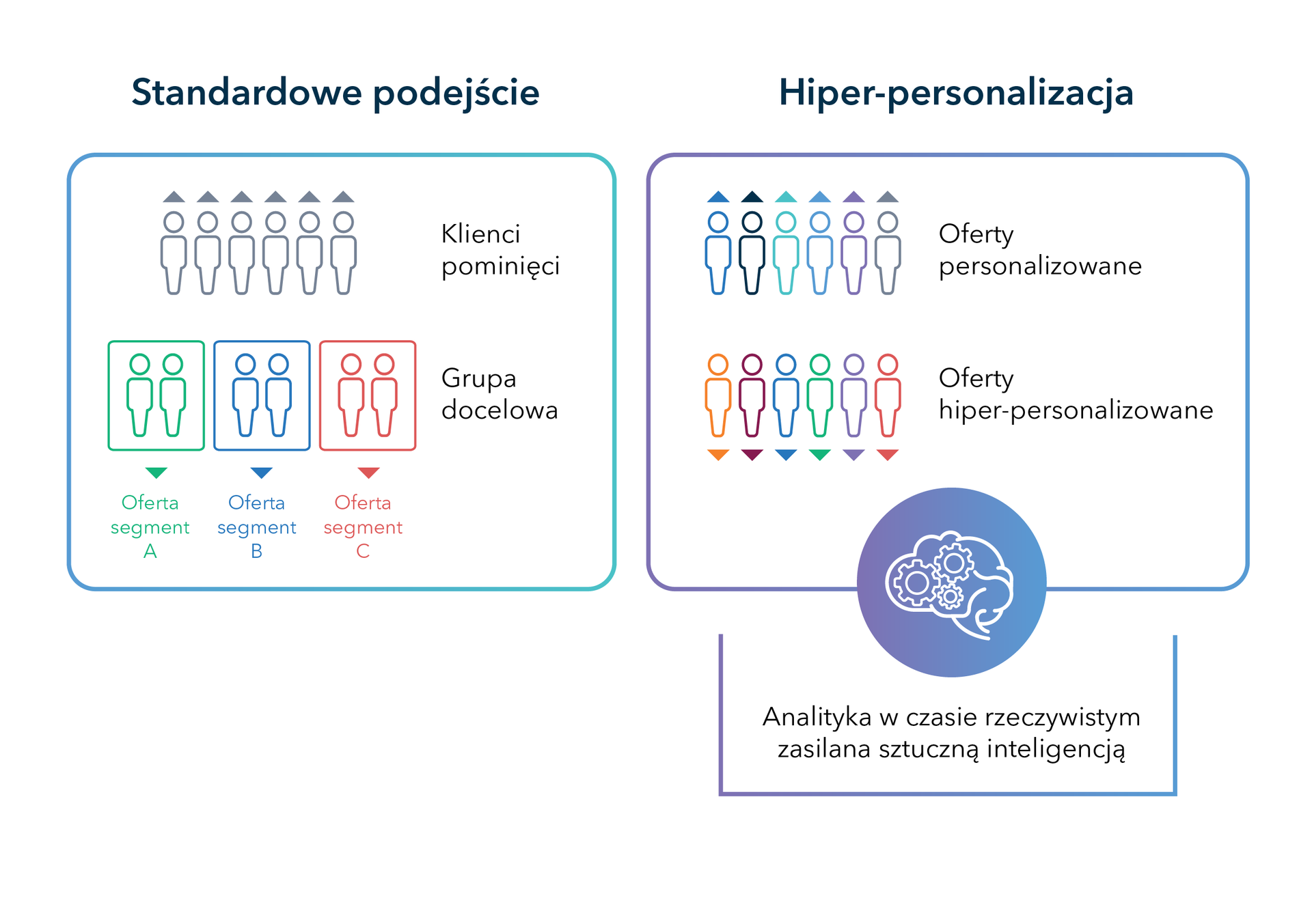 Hiperpersonalizacja idzie o krok dalej. Jej założeniem jest zastosowanie sztucznej inteligencji na danych w czasie rzeczywistym w celu wyliczenia indywidualnego prawdopodobieństwa kolejnego kroku w cyklu życia klienta z wykorzystaniem unikalnego kontekstu wynikającego z jego zachowania. Nawet jeśli przewidywany następny krok dla wielu klientów jest taki sam, algorytmy sztucznej inteligencji sprawią, że ostateczny komunikat dla każdego klienta będzie zróżnicowany ze względu na treść, moment oraz kanał dotarcia.