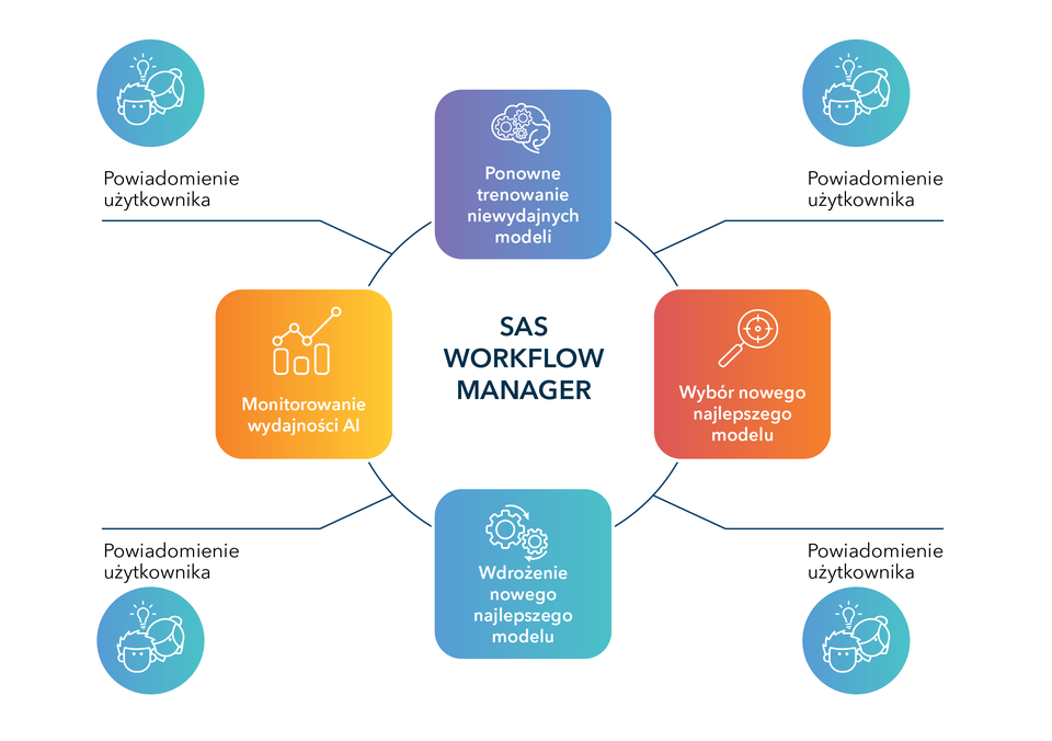 Proces rekalibracji modeli jest zarządzany przez moduł workflow, gdzie użytkownik biznesowy w wizualny sposób może zaprojektować scenariusze automatyzacji każdego elementu procesu hiperpersonalizacji, wskazując momenty, kiedy interakcja z człowiekiem jest wymagana (np. do podjęcia decyzji) lub opcjonalna (np. w celu notyfikacji o wykonanym kroku kalibracji modelu).
