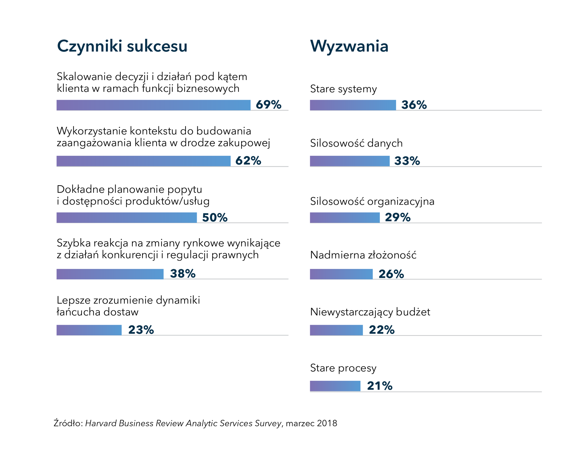Analizując wnioski, okazuje się, że najważniejszym czynnikiem sukcesu jest umiejętność wbudowania procesów analitycznych w centralny proces decyzyjny zarządzający doświadczeniem klienta w jego „podróży” przez kanały kontaktu i systemy transakcyjne. Niemniej największym wyzwaniem ciągle jest integracja danych. Systemy domenowe, które nie są gotowe na otwarte standardy integracji, czy silosy danych, które ogromnie zwiększają złożoność budowania unikalnego spojrzenia na klienta – to najczęstsze wyzwania w tym obszarze.