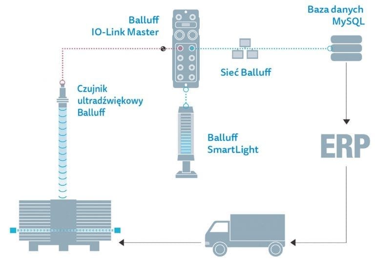 Schemat wykorzystania rozwiązań IIoT do zarządzania stanem magazynowym kartonowych opakowań w firmie Balluff