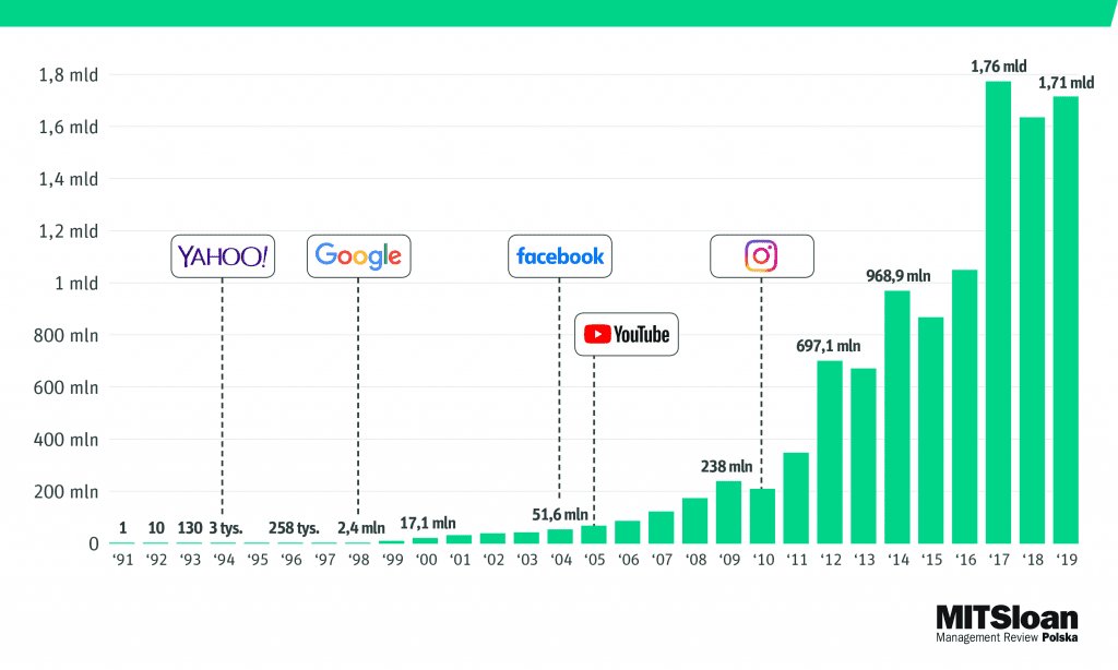 Co może być powodem spowolnienia wzrostu liczby stron internetowych (a nawet jej zmniejszenia)? Jedną z przyczyn – z perspektywy świata biznesu – jest wzrastająca popularność mediów społecznościowych. Część firm, zwłaszcza mniejszych, w ogóle nie korzysta z firmowych stron WWW, wykorzystując do kontaktów z klientami i reklamowania swojej oferty media takie jak Facebook, Instagram czy Twitter.