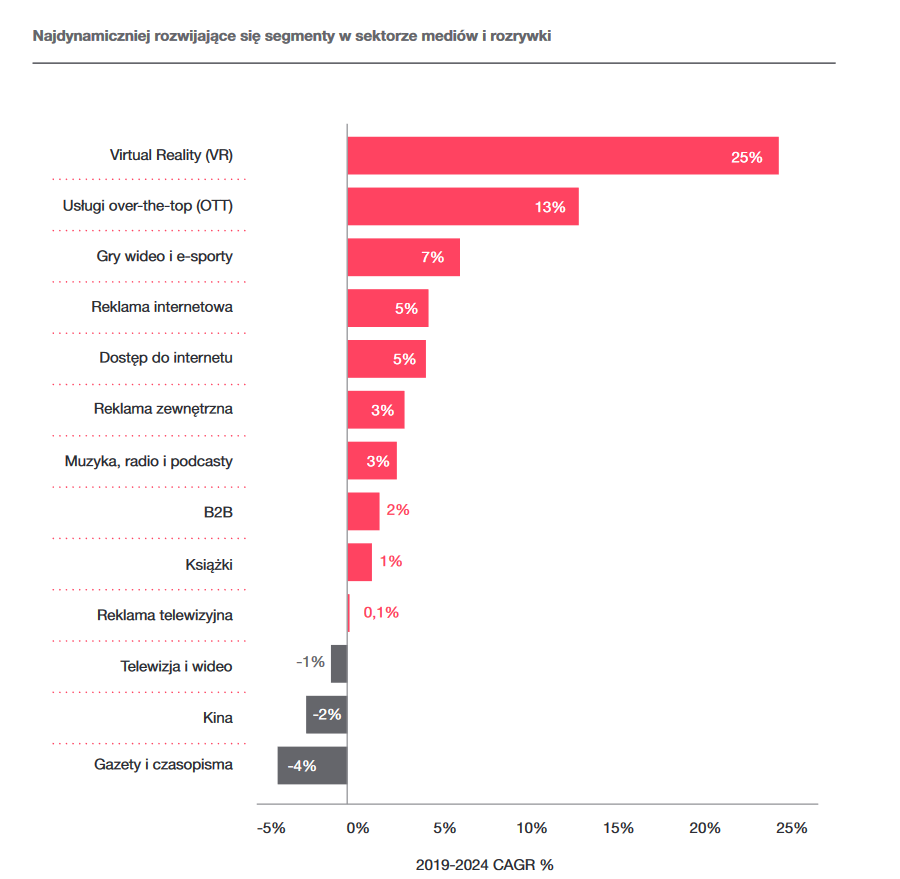 W obecnej sytuacji najbardziej dynamicznie rozwijają się usługi wykorzystujące wirtualną rzeczywistość (VR). Eksperci PwC przewidują, że średnioroczny wzrost przychodów (CAGR) w przypadku usług opartych na technologii VR w latach 2019‑2024 wyniesie 25%. W kolejnych latach będą też rosły na znaczeniu usługi over the top (OTT), a także gry i e‑sport. Natomiast coraz gorszych wyników finansowych mogą spodziewać się wydawcy tradycyjnej prasy, nadawcy telewizyjni i oraz właściciele kin. Tradycyjne media coraz bardziej będą wypierane z rynku przez usługi oparte na możliwościach, jakie niesie ze sobą powszechny dostęp do internetu, czemu sprzyja rozwój sieci komórkowej 5G.