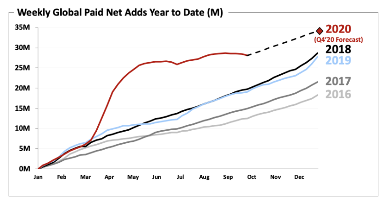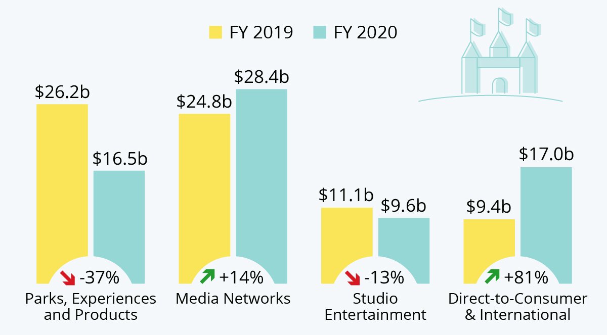 O ile ten serwis odnotował rekordowe zyski w ostatnich miesiącach, to sytuacja gorzej wygląda w przypadku The Walt Disney Company. Analiza sprawozdania finansowego podsumowującego ostatni rok fiskalny pokazuje, że Disney odnotował bardzo duże, 37‑procentowe spadki przychodów. Spadek dotyczy parków rozrywki i sprzedaży gadżetów, co oznacza prawie 10 miliardów dolarów straty rok do roku. Z kolei decyzja o zamknięciu kin podjęta przez rządy wielu państw, odbiła się negatywnie na wpływach z produkcji filmów, które spadły o półtora miliarda dolarów (-13% rdr).