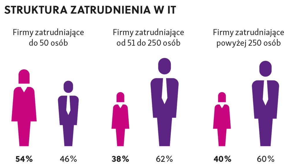 Wyniki raportu potwierdzają, że branża IT nadal jest zdominowana przez mężczyzn – widać to szczególnie w przypadku przedsiębiorstw zatrudniających od 51–250 i powyżej 250 pracowników – kobiety stanowią tam odpowiednio 38% i 40% kadry. Najlepiej kwestia ta wygląda w firmach posiadających do 50 pracowników – co druga osoba zatrudniona to kobieta (dokładnie 53,7%).