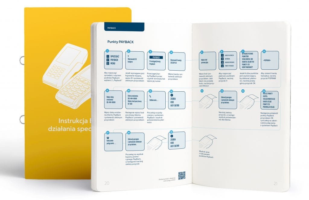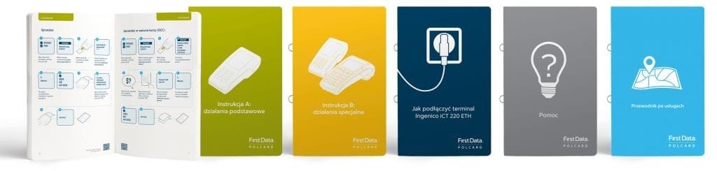 Dopiero wtedy, gdy mieliśmy opracowaną sekwencję instruktażową w wersji wideo, przystąpiliśmy do prac nad wersją papierową. Wybraliśmy formę segregatora w rozmiarze nieco mniejszym niż A4, dzięki czemu łatwo znaleźć dla niego miejsce na przykład w szafce przy kasie. Jego układ porządkuje treści i pozwala na spersonalizowanie zawartości dzięki dołączeniu materiałów poświęconych konkretnej branży czy danemu terminalowi. Gwarantuje to, że hotelarz nie otrzyma informacji, które interesują sprzedawcę w sklepie i na odwrót. Eleganckie i trwałe okładki segregatora powodują, że niełatwo go zniszczyć i że raczej nie zostanie wyrzucony ani zagubiony. Pierwszym i jedynym słowem, stanowiącym kwintesencję, a zarazem znak rozpoznawczy pakietu instrukcji, jest słowo „Witaj!”, które umieszczono na okładce. W środku jest pięć książeczek w różnych kolorach, omawiających takie zagadnienia, jak: działania podstawowe (zielony), działania rozszerzone (żółty), przewodnik po usługach (niebieski), oznakowanie (pomarańczowy) i pomoc (szary). Format publikacji zapewnił jej czytelność i poręczność, a dobrana gramatura papieru zagwarantowała trwałość. Użytkownik może przeprowadzić każdą operację, trzymając terminal w jednej ręce, a instrukcję w drugiej. Każda z nich zajmuje dokładnie jedną stronę ilustrowanego opisu. Na nowo zaprojektowaliśmy też naklejki informujące o przyjmowaniu płatności bezgotówkowych. Dzięki zastosowaniu odpowiednich technologii ich kolory nie płowieją, a zaokrąglenie rogów sprawia, że prezentują się profesjonalnie i nie odklejają.