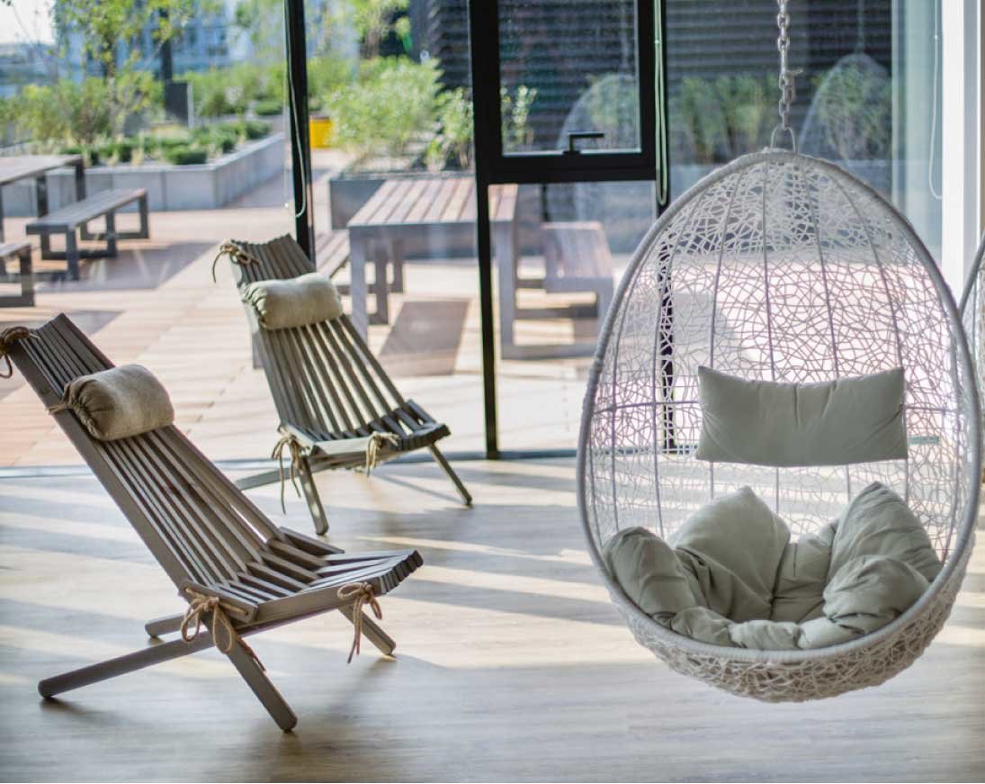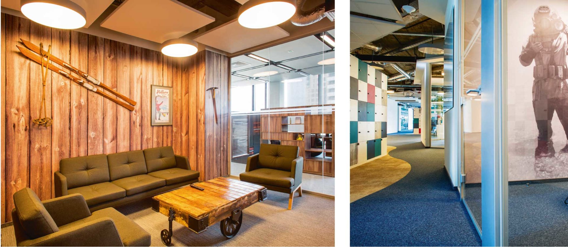 Dużo uwagi poświęciliśmy estetyce nowego biura. Wszystkie stanowiska pracy są wyposażone w wysokiej jakości meble ergonomiczne fotele i krzesła, wygodne biurka i stoły, a także kanapy i szafki w różnych kolorach. Pracownicy wspólnie wybierali nazwy poszczególnych pięter Las, Miasto, Niebo, Morze i Góry z których każde zostało zaaranżowane w niepowtarzalny sposób z wykorzystaniem fototapet, a także specjalnie dobranych elementów, takich jak plażowe kosze czy stoliki wykonane z pni drzew.