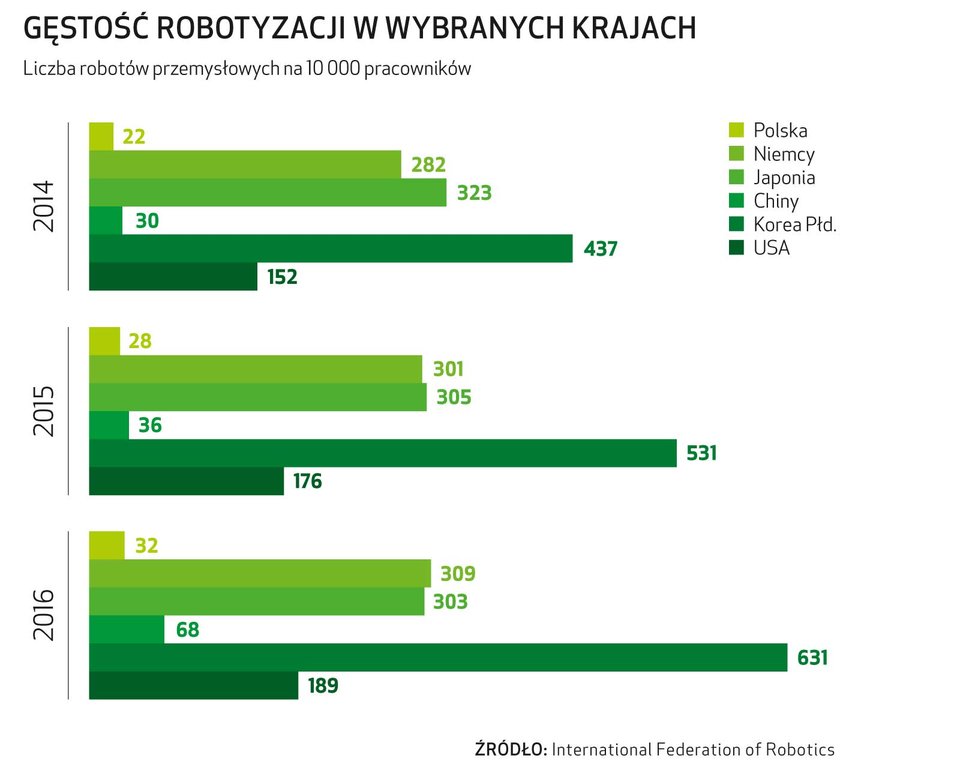 W światowym zestawieniu najbardziej zrobotyzowanych krajów od wielu lat przoduje Korea Południowa. Za nią znajduje się Singapur. Państwa, które w powszechnej wyobraźni najczęściej kojarzą się z robotyzacją, takie jak Stany Zjednoczone, Japonia i Niemcy, mają w połowie tak dobre wyniki. Najsilniej pod względem gęstości robotyzacji rozwijają się Chiny.
