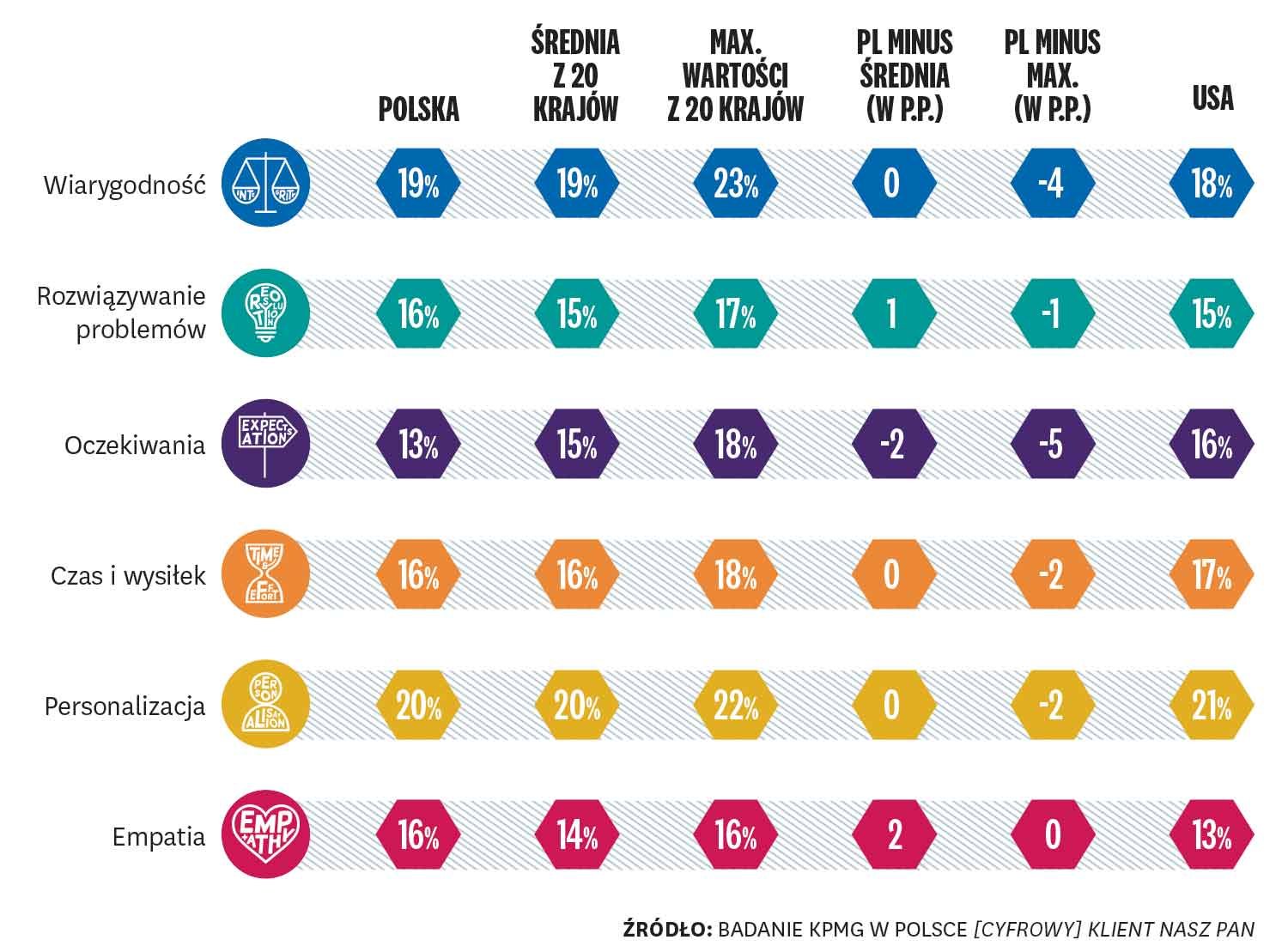 Marki, które zapewniają klientom najlepsze doświadczenia, mają średnio o 9 p.p. wyższą dynamikę wzrostu przychodów niż konkurencja – takie wnioski płyną z analiz KPMG w Polsce zawartych w raporcie [Cyfrowy] klient nasz Pan. Chcąc ocenić, jak marki zarządzają na polskim rynku doświadczeniami klientów, firma doradcza po raz drugi zapytała ponad pięć tysięcy respondentów, jak oceniają swoje interakcje z firmami z dziewięciu branż. Analogiczne badania zgodnie z tą samą metodologią zostały przeprowadzone przez KPMG w 20 innych krajach świata. Analiza została oparta na bazie unikalnej metodologii Sześciu Filarów™ Customer Experience, która pozwala zrozumieć prawdziwe doświadczenia klienta we wszystkich interakcjach z marką. Tymi filarami są: Wiarygodność, Rozwiązywanie problemów, Oczekiwania, Czas i wysiłek, Personalizacja oraz Empatia. Filary te pozwalają lepiej zrozumieć, które aspekty są szczególnie istotne dla klienta w całym cyklu relacji konsumenta z marką i jej produktami.