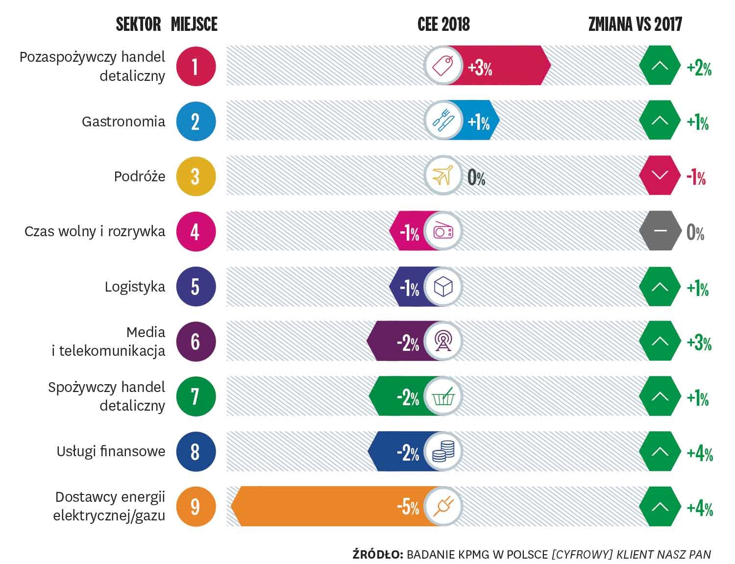 Podobnie jak w poprzedniej edycji badania polscy konsumenci najlepiej ocenili swoje doświadczenia z markami związanymi z pozaspożywczym handlem detalicznym (wzrost wskaźnika CEE o 2%) oraz markami gastronomicznymi (wzrost wskaźnika CEE o 1%). Pozaspożywczy handel detaliczny jest najbardziej konkurencyjną branżą w Polsce, dlatego zorientowanie na potrzeby klienta jest kluczem do sukcesu na rynku. Marki z tego sektora mają również wieloletnie doświadczenie w cyfrowych relacjach z klientami, zarówno w zakresie marketingu, jak i sprzedaży oraz obsługi klientów online.