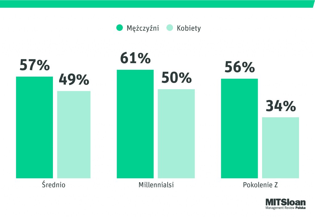 Niemal trzech na pięciu badanych mężczyzn jest przekonanych, że rozwój techniki pozytywnie wpłynie na społeczeństwo, natomiast w przypadku kobiet – mniej niż połowa. Bardziej znaczący – również z perspektywy biznesu – wydaje się jednak rosnący sceptycyzm ludzi młodszych: pokolenie Z (urodzeni po 1995 r.) generalnie niżej ocenia pozytywny wpływ nowych technologii niż pokolenie Millennialsów (urodzeni w latach 1981–1995).