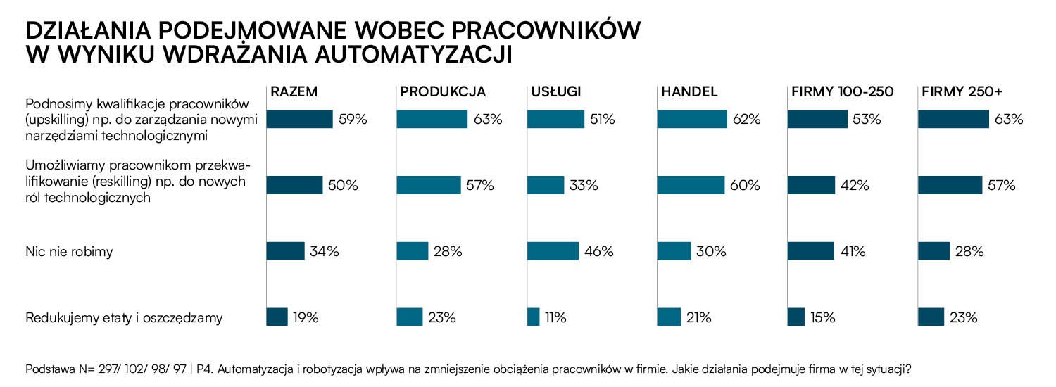 Natomiast z badania Future Collars i ICAN Institute wynika, że na priorytety dotyczące inwestowania w automatyzacji duży wpływ ma sektor, w którym działa przedsiębiorstwo. Produkcja automatyzuje przede wszystkim procesy wytwórcze, handel stawia na automatyzację marketingu, sprzedaży i obsługi klienta, a usługi stawiają na marketing i finanse. Niezależnie od specyfiki branży HR‑owcy uznali, że blisko 1/5 pracowników (16,8%) może zostać zastąpiona przez automatyzację procesów, dotyczy to głównie firm produkcyjnych. Najbardziej bierne wobec automatyzacji pozostają mniejsze firmy z sektora usług. Ta branża znacznie rzadziej inwestuje również w reskilling i upskilling pracowników.