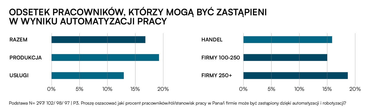 Według danych Światowego Forum Ekonomicznego, obecnie na każde 100 roboczogodzin przypada 29 godzin pracy robotów, a w 2025 roku ma to być już ponad połowa. Analitycy z PwC przewidują, że blisko 1/3 wszystkich stanowisk pracy w Polsce ma potencjał na zautomatyzowanie. Jeszcze większymi optymistami są przedstawiciele McKinsey Polska. Na łamach raportu Ramię w ramię z robotem. Jak wykorzystać potencjał automatyzacji w Polsce wskazują oni, że do 2030 r. blisko 7,3 mln stanowisk pracy może być zastąpionych robotami, a czynności, które z powodzeniem wykonają samodzielne maszyny, obecnie stanowią blisko połowę łącznego czasu pracy.