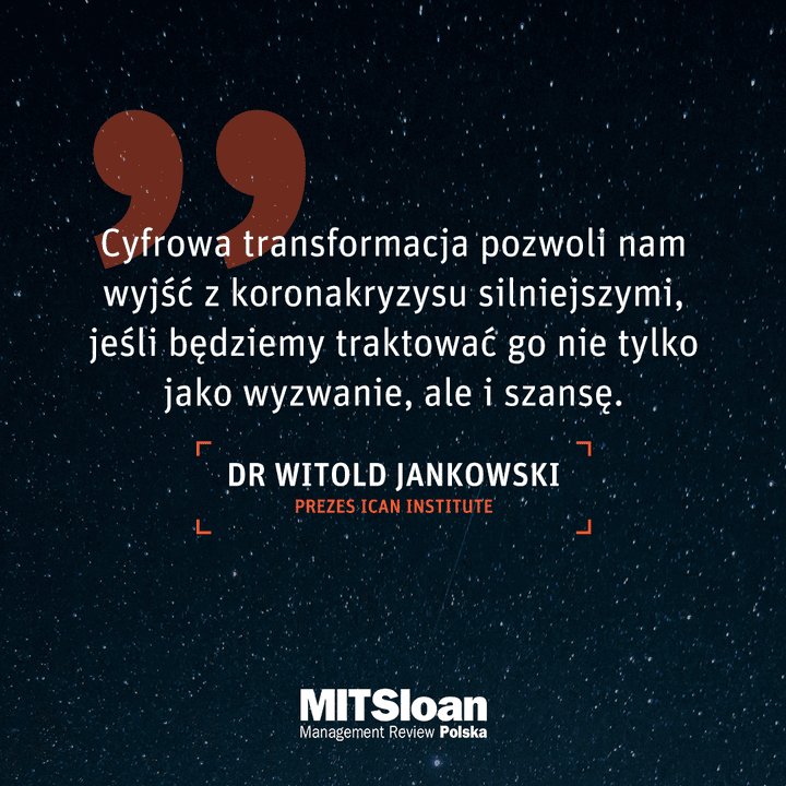 Po oficjalnym otwarciu wydarzenia przez Pawła Góreckiego, redaktora naczelnego MIT Sloan Managemenet Review Polska i Andrzeja Jacaszka, wiceprezesa zarządu ICAN Institute, na wirtualną scenę wkroczył dr Witold Jankowski, prezes zarządu ICAN Institute z programowym wystąpieniem „Tylko technologia może nas uratować”.