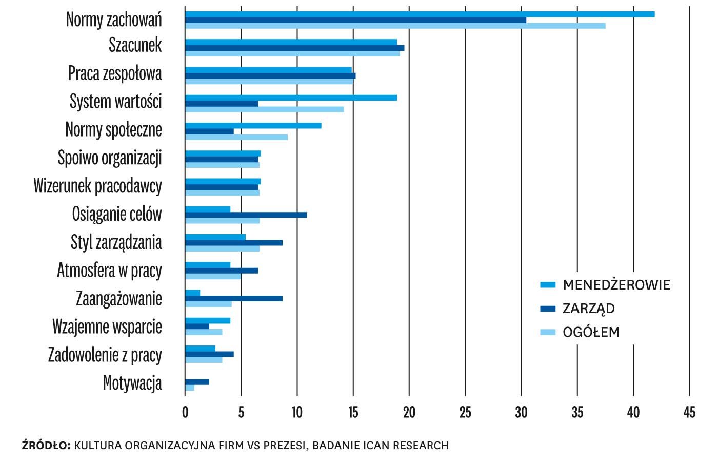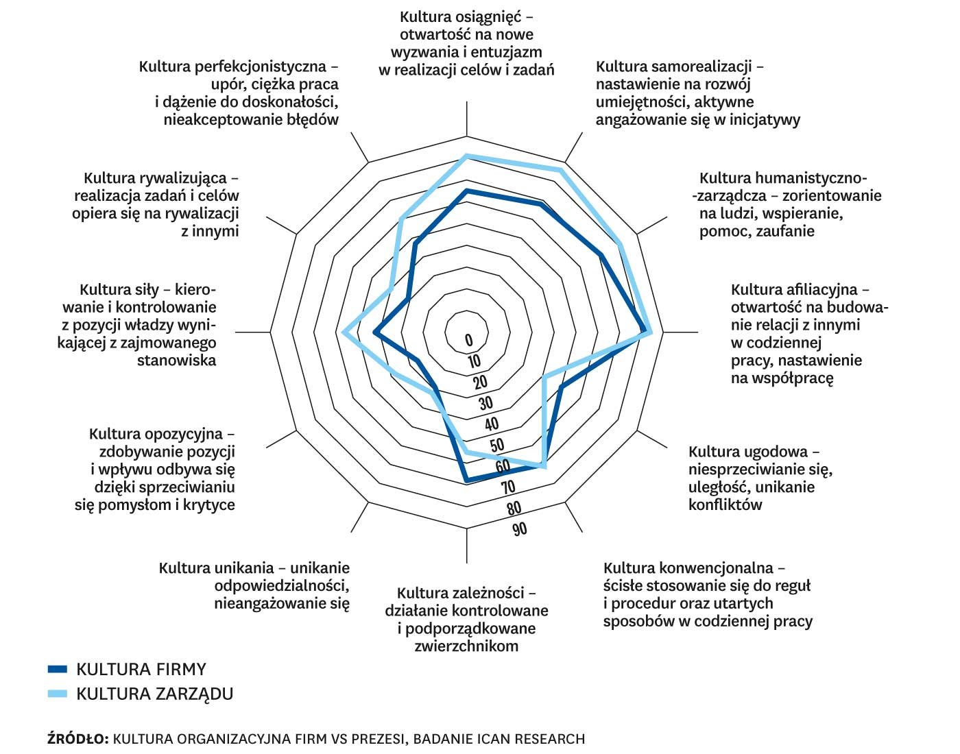 Gdy w ubiegłym roku zaprosiliśmy do Warszawy Johna van Ettena, światowego eksperta ds. rozwoju kultury organizacyjnej, powiedział nam (HBRP nr 169):” Liderzy oddziałują na organizację w trzech obszarach. Pierwszy wynika ze strategii przywódczych technik, jakie menedżer stosuje wobec podwładnych, by ich motywować lub przekazywać informacje zwrotne. Drugi obszar nazywamy tworzeniem klimatu organizacji – lider wskazuje, jak ma być zbudowana struktura firmy pod względem celów, reguł, podziału władzy czy kanałów komunikacji wewnętrznej. Ostatni odzwierciedla zachowania przywódcy w stosunku do pracowników – podwładni często naśladują sposób bycia szefa, co sprawia, że staje się on normą”. Rok później ICAN Research przeprowadził badanie jakościowe i ilościowe, żeby dowiedzieć się, jak w praktyce rozumieją kulturę organizacyjną polscy menedżerowie.