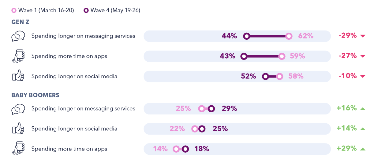 Indeks górny Zmiana procentowa w częstotliwości wykonywania wybranych czynności: użytkowania komunikatorów, serwisów społecznościowych i aplikacji mobilnych. Dla pokolenia Z i dla tzw. Baby Boomers (znacznie starsze pokolenie ludzi urodzonych w latach 1946‑64). Porównanie zachowań obu grup w tygodniach pod koniec marca i pod koniec maja 2020. Źródło: GlobalWebIndex Indeks górny koniecZmiana procentowa w częstotliwości wykonywania wybranych czynności: użytkowania komunikatorów, serwisów społecznościowych i aplikacji mobilnych. Dla pokolenia Z i dla tzw. Baby Boomers (znacznie starsze pokolenie ludzi urodzonych w latach 1946‑64). Porównanie zachowań obu grup w tygodniach pod koniec marca i pod koniec maja 2020. Źródło: GlobalWebIndex