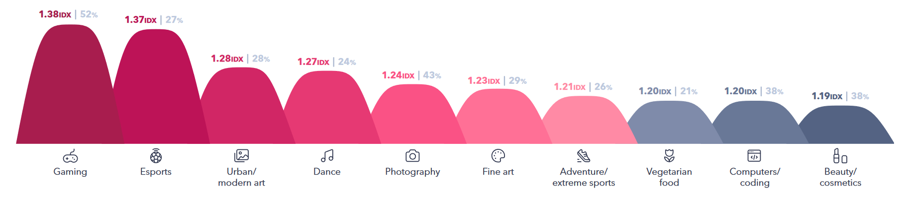 Indeks górny Procent przedstawicieli generacji Z zainteresowanych poszczególnymi aktywnościami. Źródło: GlobalWebIndex Indeks górny koniecProcent przedstawicieli generacji Z zainteresowanych poszczególnymi aktywnościami. Źródło: GlobalWebIndex