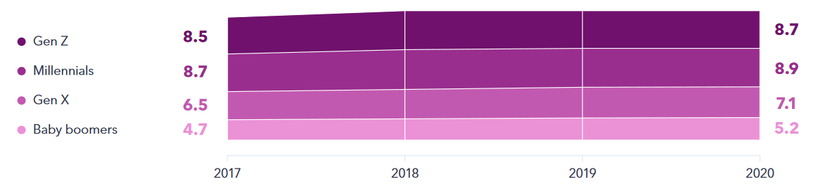 Indeks górny Średnia liczba kont w mediach społecznościowych u użytkowników należących do poszczególnych generacji (w latach 2017‑2020). Źródło: GlobalWebIndex Indeks górny koniecŚrednia liczba kont w mediach społecznościowych u użytkowników należących do poszczególnych generacji (w latach 2017‑2020). Źródło: GlobalWebIndex