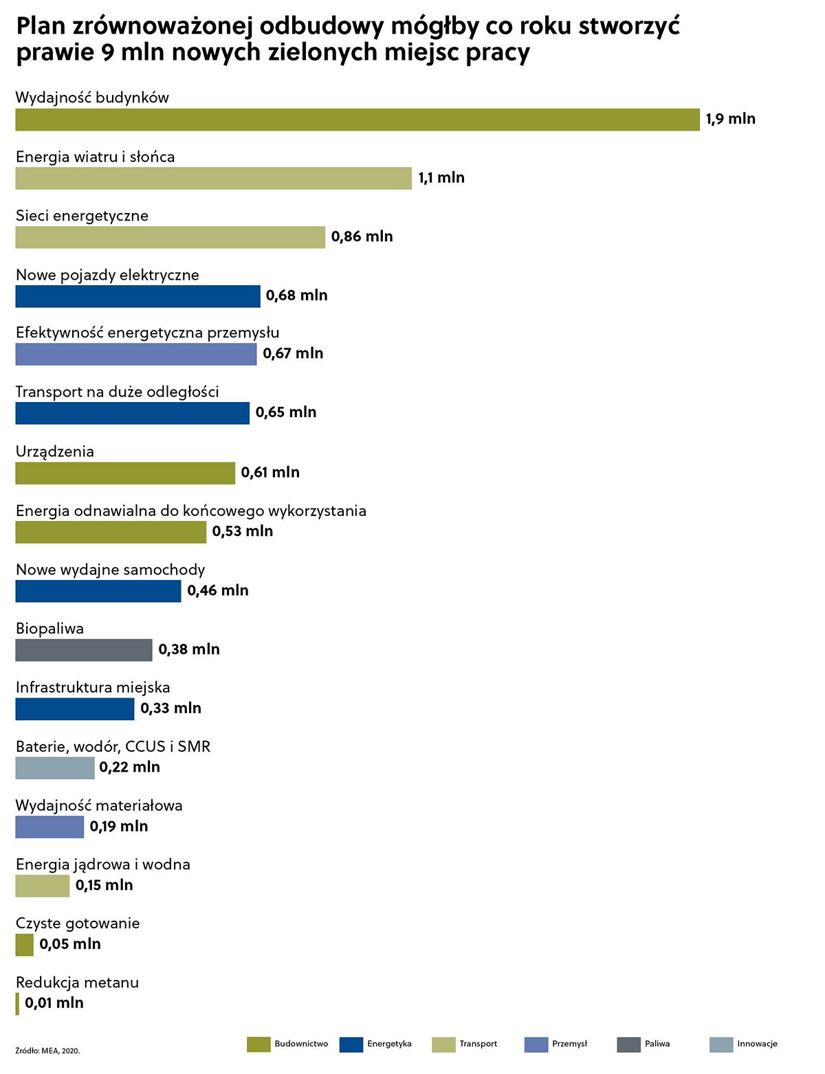 „Tworzenie miejsc pracy musi być priorytetem dla krajów, w których miliony ludzi straciły pracę w wyniku pandemii COVID‑19 i wynikającego z niej lockdownu” – czytamy w analizie MEA. Eksperci przekonują zarazem, że ukierunkowanie na zielone miejsca pracy jest bardziej efektywne niż inwestowanie pieniędzy w gospodarkę wysokoemisyjną.