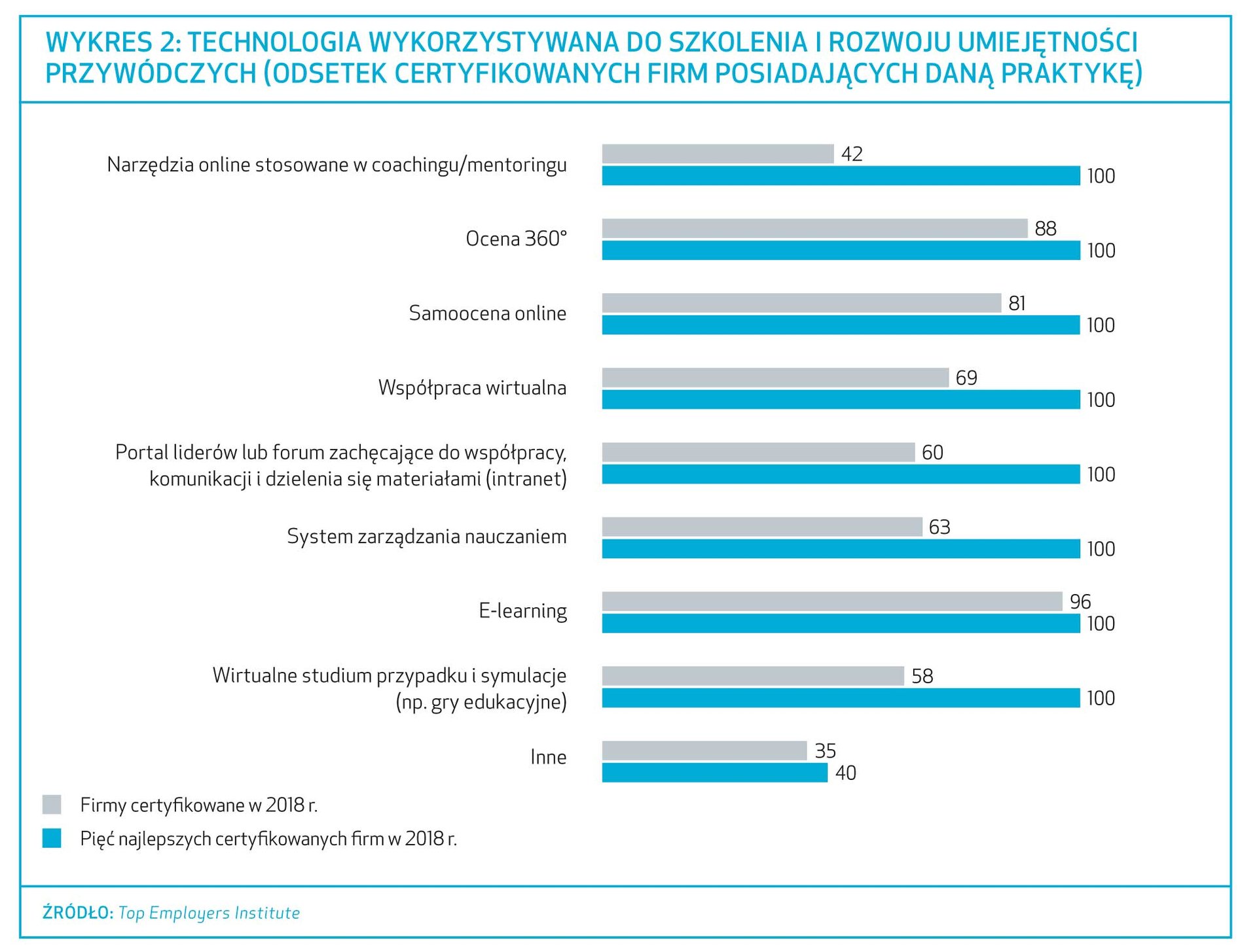 W turbulentnym otoczeniu rynkowym zmianie ulegają także wymagania co do postaw menedżerów i przyszłych liderów. Technologia może służyć pomocą także w tym obszarze. Wszystkie firmy wyróżnione certyfikatem Top Employers Polska 2018 pomagają pracownikom zidentyfikować własne potrzeby rozwojowe i szkoleniowe. Coraz częściej jest to możliwe dzięki specjalnej platformie, która pomaga wybrać własną ścieżkę rozwoju oraz zidentyfikować kompetencje i umiejętności potrzebne do osiągnięcia celu. Programy szkoleniowe również są wspomagane przez elektroniczne środowisko szkoleniowe, w którym pracownicy mogą znaleźć dodatkowe informacje na temat szkolenia, skontaktować się z innymi uczestnikami oraz śledzić swoje postępy.