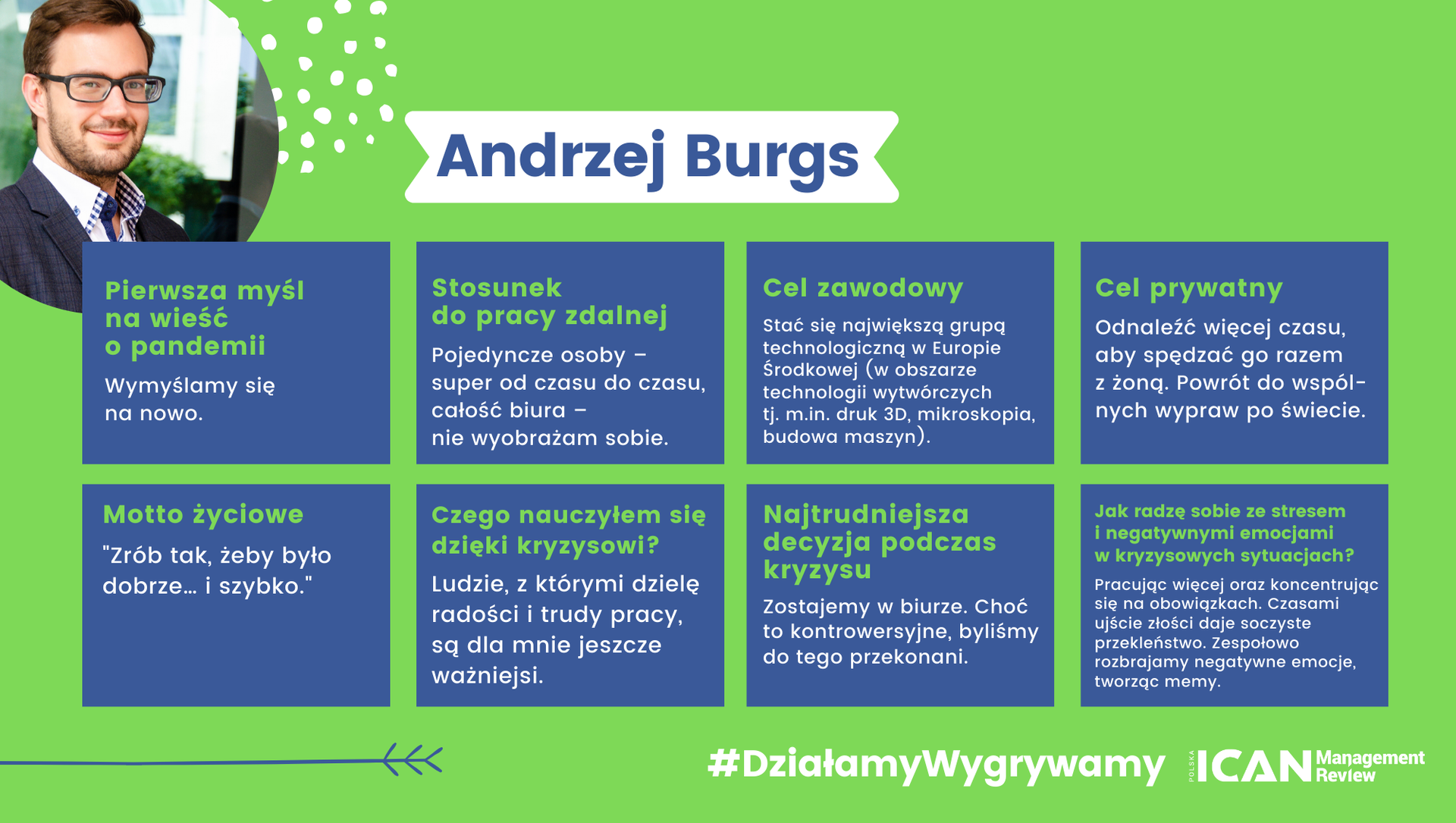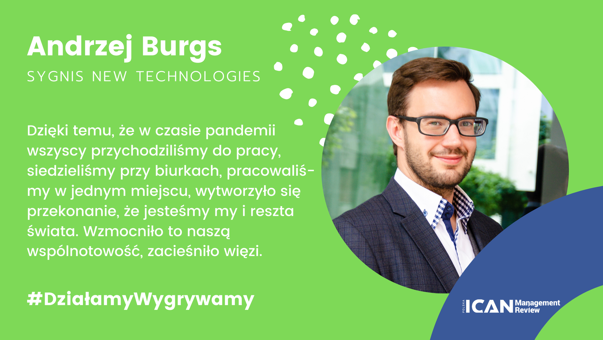 W cyklu <a href=>#DziałamyWygrywamy redakcja „ICAN Management Review” rozmawia z polskimi przedsiębiorcami o tym, jak stawiają czoła obecnym wyzwaniom oraz jak walczą o swoje lepsze jutro. Andrzej Burgs, fizyk biznesmen, prezes i właściciel Sygnis New Technologies, opowiada, jak z dnia na dzień dostosował działalność firmy do popytu na rynku. Tłumaczy, dlaczego nie wdrożył pracy zdalnej nawet dla pracowników biurowych, jak zadbał o bezpieczeństwo zespołu, organizując koleżeński dowóz do parku maszynowego, oraz dlaczego na początku pandemii krwawiły mu ręce. Rozmawia Joanna Koprowska.